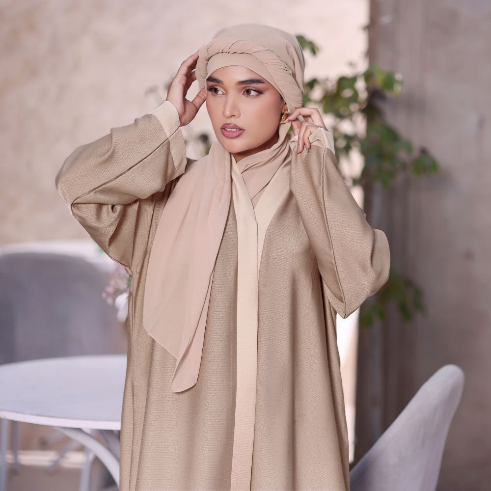 Radiate soft elegance with this two-tone abaya in beautiful shades of Beige and foun crafted from premium flowy fabric that feels smooth and comfortable against the skin. . Its graceful color blend and elegant silhouette make it perfect for gatherings casual outings or special occasions. Designed to drape beautifully this piece combines comfort femininity and timeless sophistication.