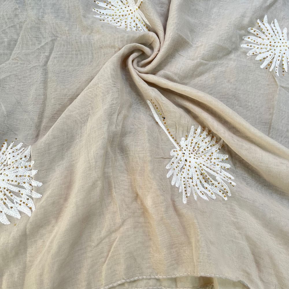 The delicate leaf embroidery adds a touch of nature-inspired artistry while the subtle pearl and stone embellishments elevate its elegance catching the light with every movement. Designed for the modern woman who values both style and sophistication this hijab is a statement piece that effortlessly combines tradition with contemporary fashion
